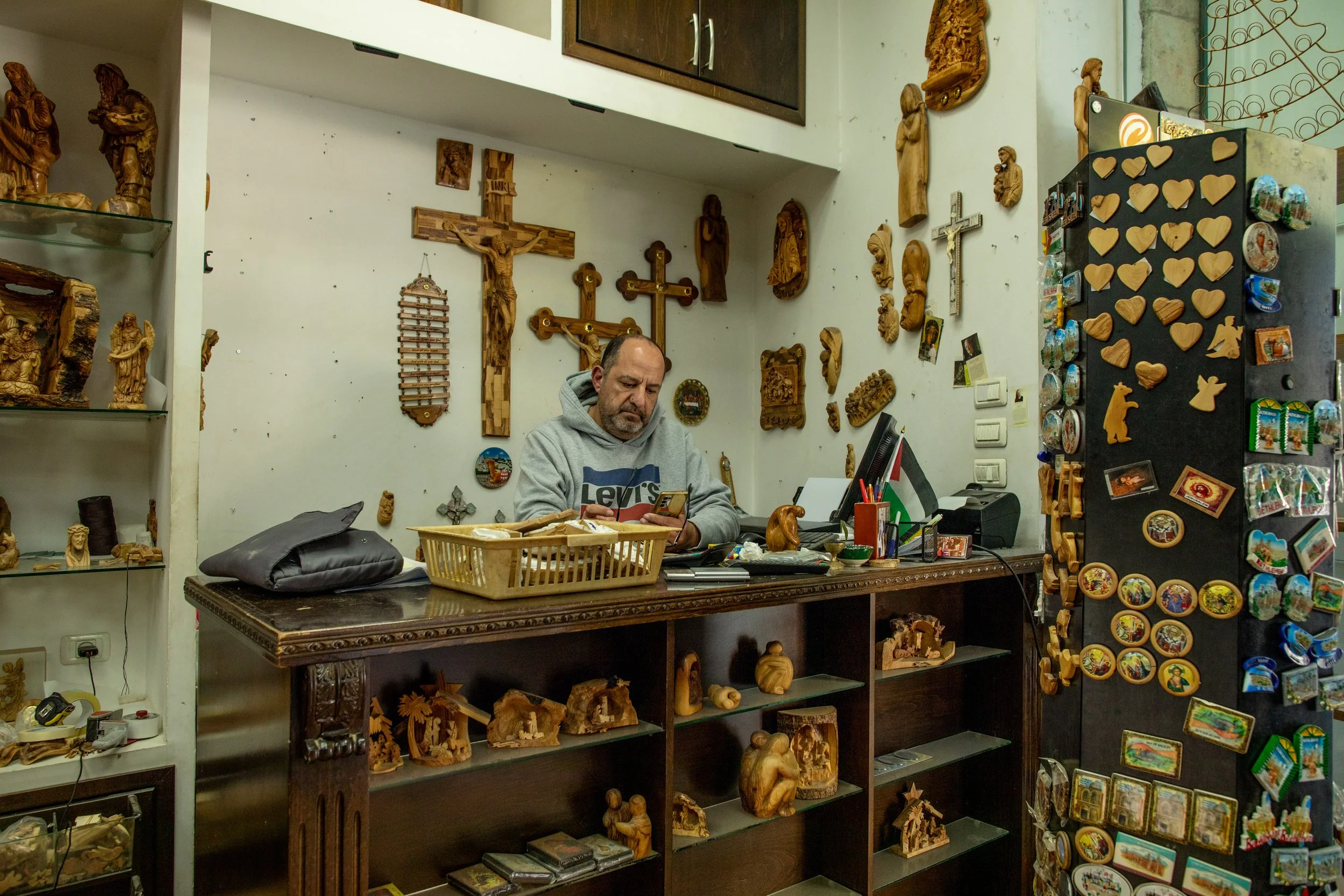 For Palestinian Christian Jack Giacaman and his family-owned souvenir shop in Bethlehem, times are hard. Tourists and their purchases that normally bolstered Giacaman's business and Bethlehem's local economy have disappeared since the Israel-Hamas war began on Oct. 7. Giacaman said, "We used to get at least 200 visitors a day before the war. Now we get zero." To supplement this lost income, Giacaman said he's prioritizing online sales, but his shop, My Christmas House, is still struggling. "We're trying to keep workers as much as we can, but it's not easy," he said. Between Israel's wartime ban on Palestinian workers, partial salary payments from the Palestinian Authority and a dried-up tourism industry, Giacaman said life in the occupied West Bank is not easy. "For Palestinians living in the West Bank it is a disaster," he said.